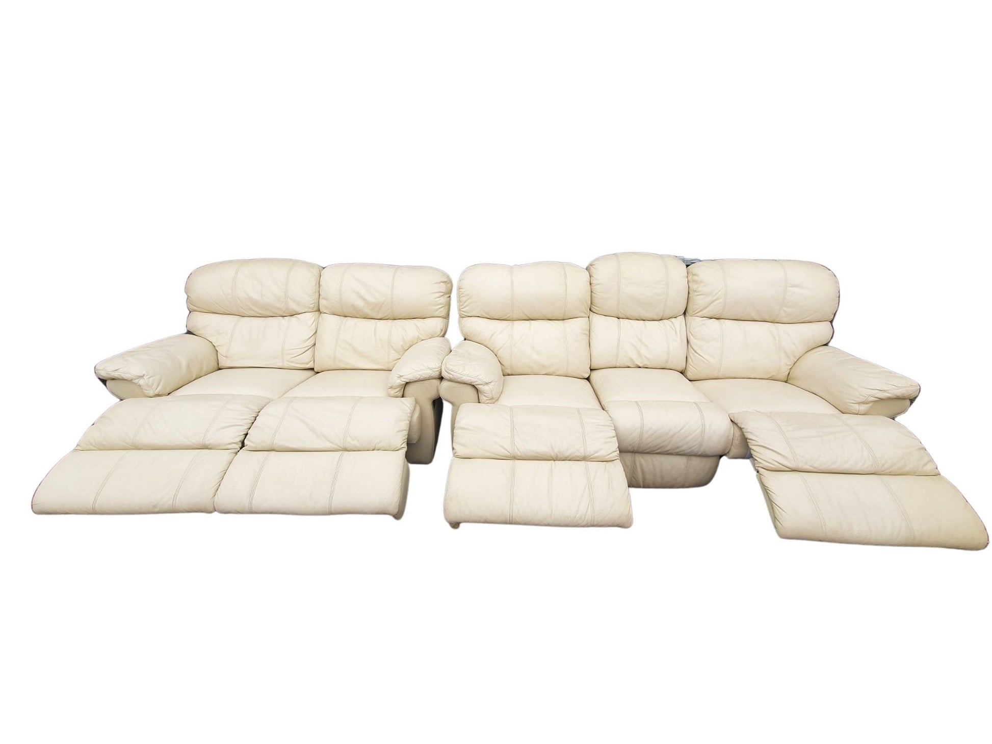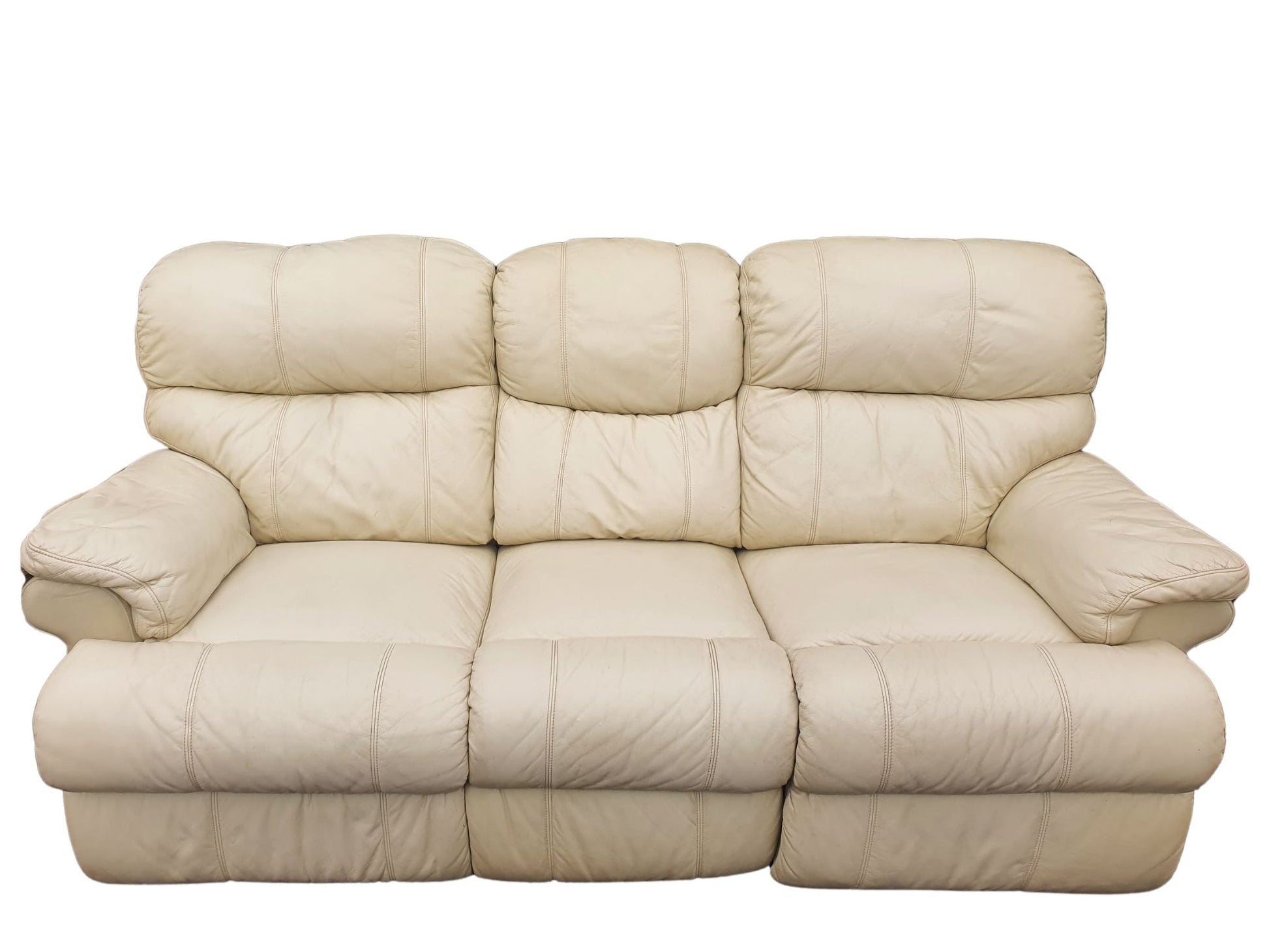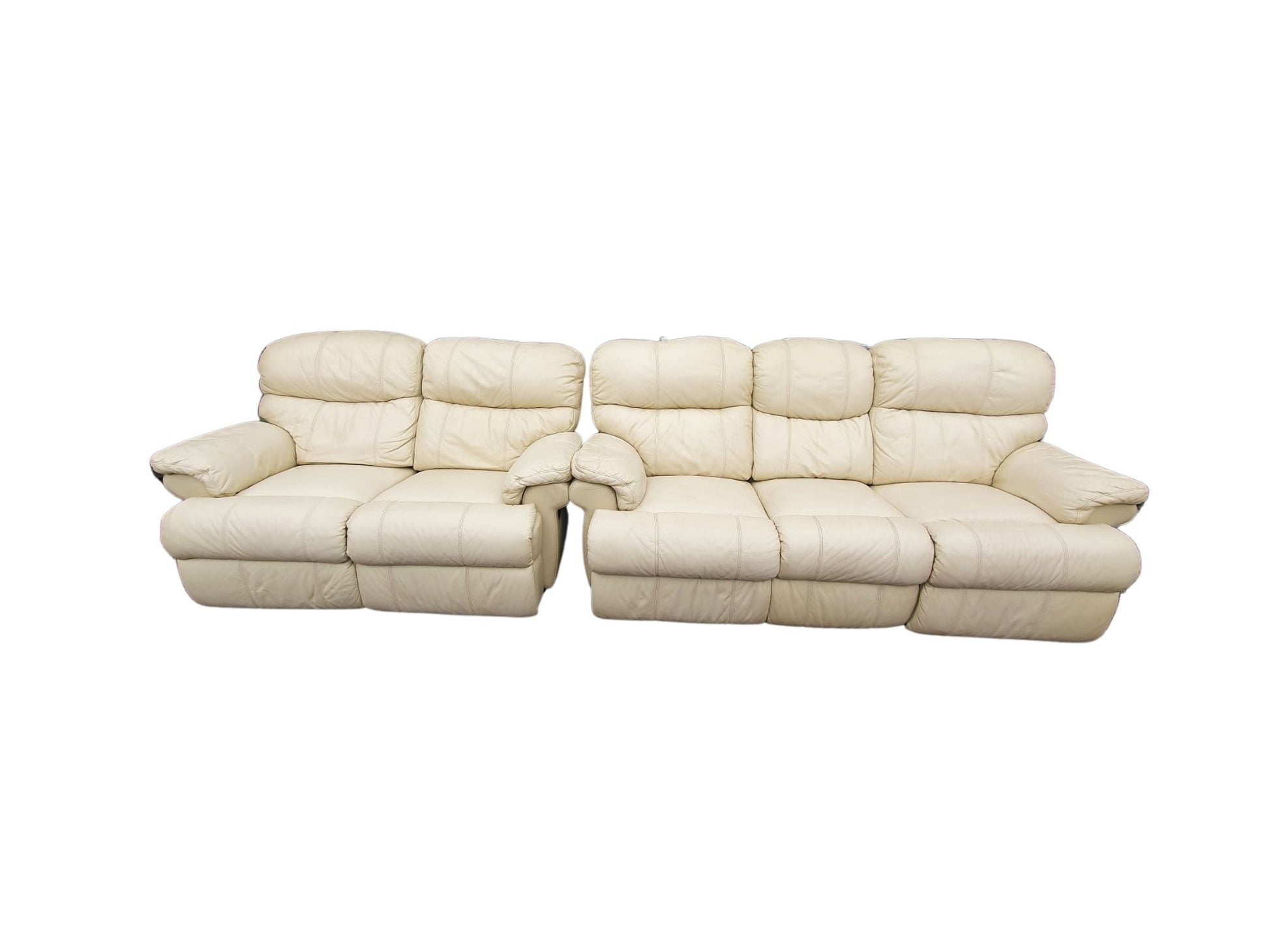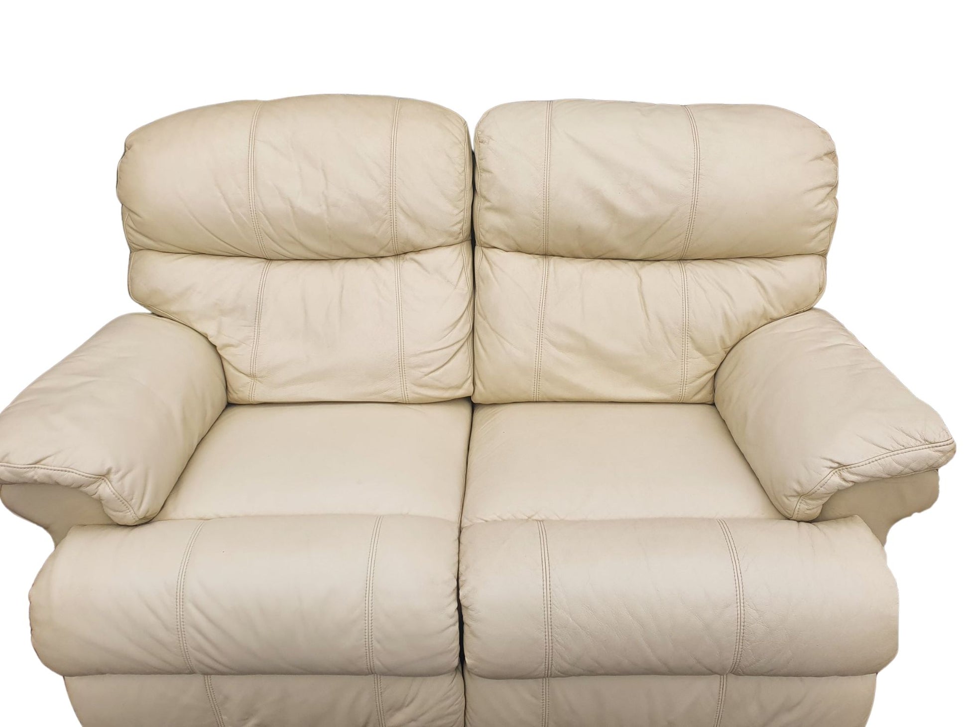 This Real Leather DFS Sofa Set Recliners in cream a 3 seater with a matching 2 seater is in great condition and comes apart for easy transportation. With two manual recliners included for both sofas, you can relax in comfort and style. Delivery is also available - call 07490083958 to learn more.