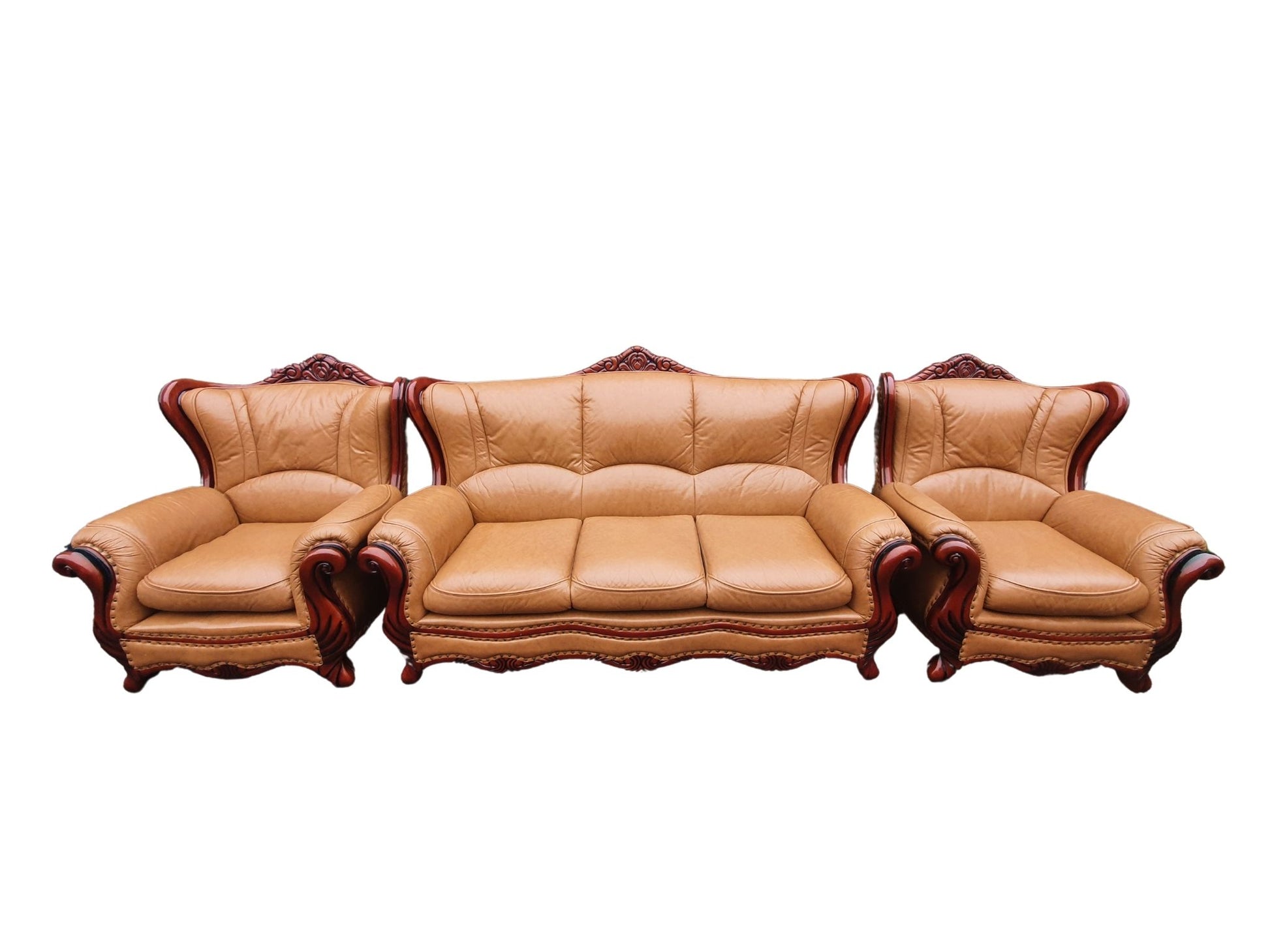 Upgrade your living room with our Real Leather Italian Sofa Set in a beautiful Tan Colour. The set includes a luxurious 3-seater sofa and 2 armchairs with a stunning wooden trim. Crafted with high quality leather, this set offers both style and exceptional comfort. Delivery available, call 07490083958 for more details.